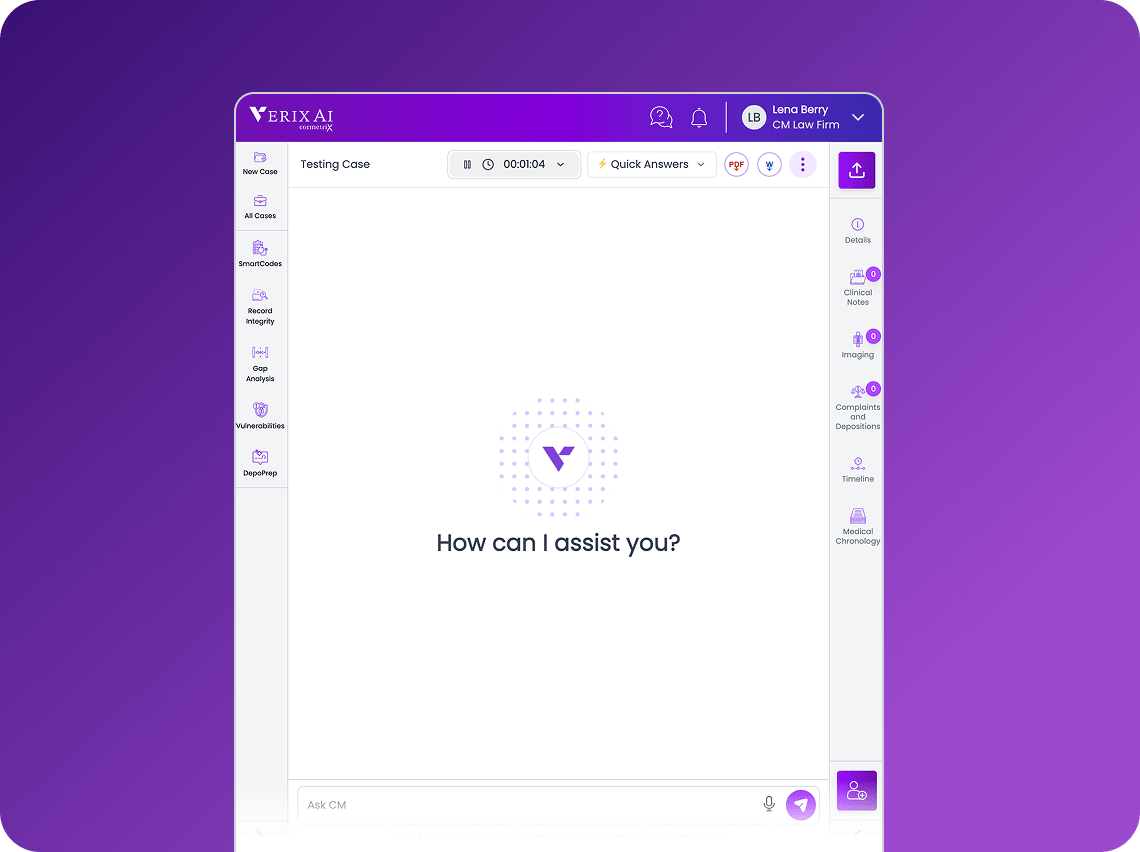 VerixAi™ is purpose-built for attorneys, medical experts, LNCs and other professionals who need to review, analyze, and defend complex medical records in legal proceedings.