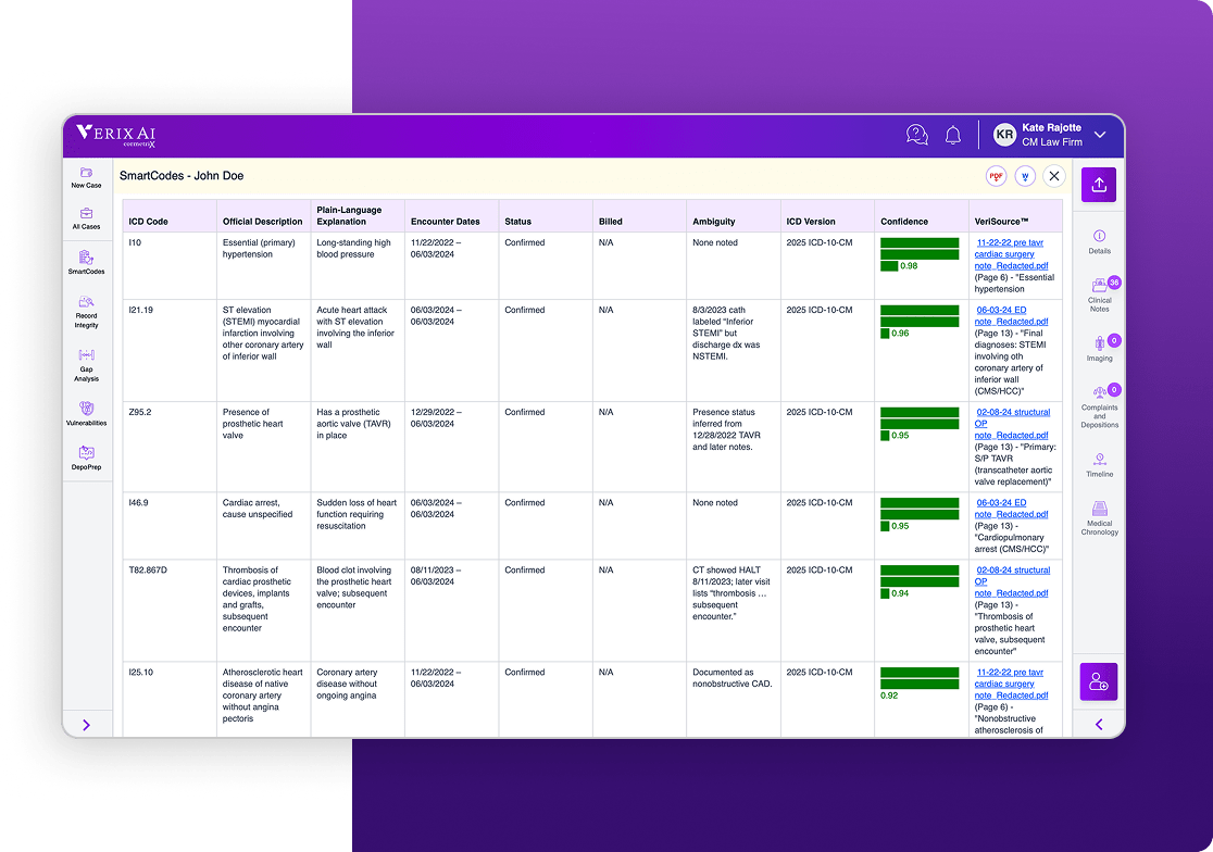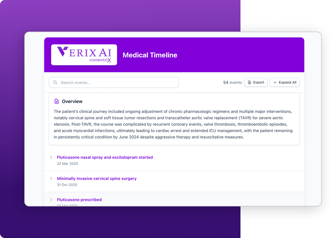 Purpose-built software that uses AI and clinical expertise to turn complex medical records into structured, defensible insight—bringing speed, transparency, and precision to every case.