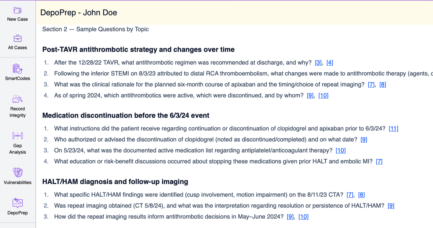 VerixAi builds question outlines, document callouts, and fact patterns—helping you focus on interpretation and testimony rather than manual preparation.